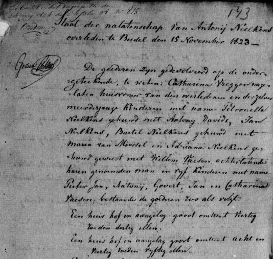 Staat der nalatenschap van Antonij Neelkens overleden te Budel den 15 november 1823.