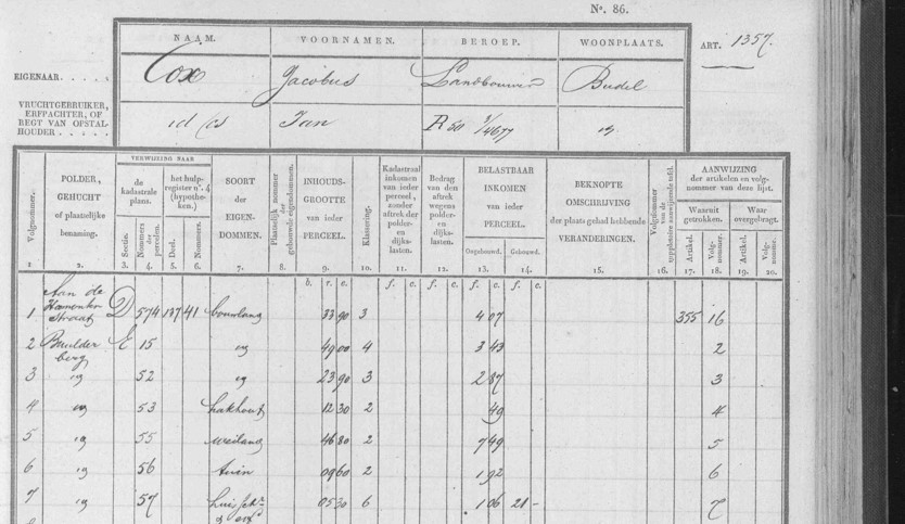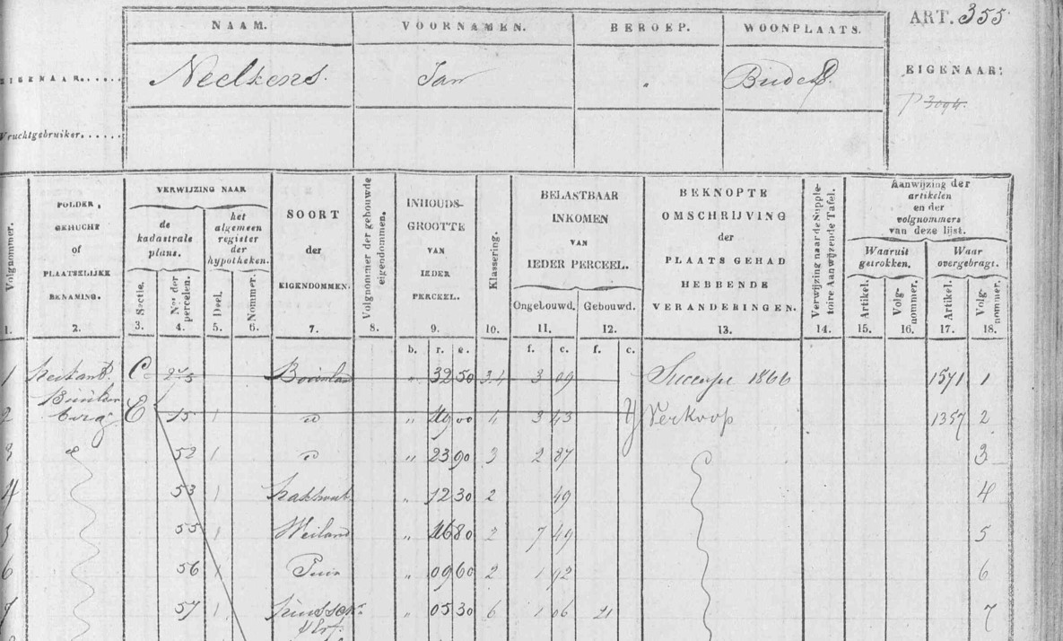 De nieuwe wijze van kadastrale registratie (PKL persoonlijke kadastrale legger). Voor Johannes Neelkens werd artikel 355, met o.a. huis schuur en erf E-0057 geopend.