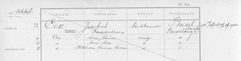 1866 Jacobus Cox overleden na zijn overlijden worden zij weduwe en kinderen eigenaar.