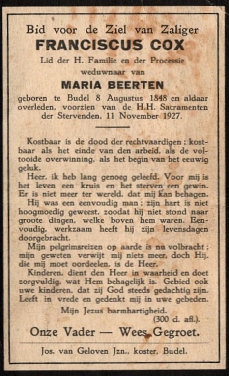 Francis | Cox | 08-08-1848 | Budel | 11-11-1927 | Budel |