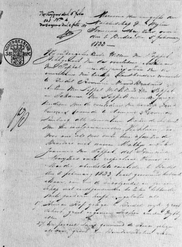 Wij ondergetekende Willem van Poppel echtgenoot van de overledene, Adriaan van Poppel meerderjarige zoon van de overledene van beroep landbouwers wonende te Budel Provincie Noord Braband en Antonie van Poppel, Wilhelmus van Poppel en Johanna van Poppel meerderjarige kinderen van de overledene van beroep landbouwers, wonende te Hamond provincie Limburg alle domicilie (wettelijk adres) kiezende ten huize van de eerstgenoemden, verklaren zoo voor ons als voor onzen twee afwezende broeders met name Mathijs en Peter Johannes van Poppel, dat Francina Muijzers onze respectieve vrouw en moeder ab intestato (zonder geldig testament) overleden te Budel den 5 februari 1833 laatst gewoond hebbende aldaar aan ons de navolgende in gemeenschap met eerstgenoemden bezeten hebbende vaste goederen heeft nagelaten.
