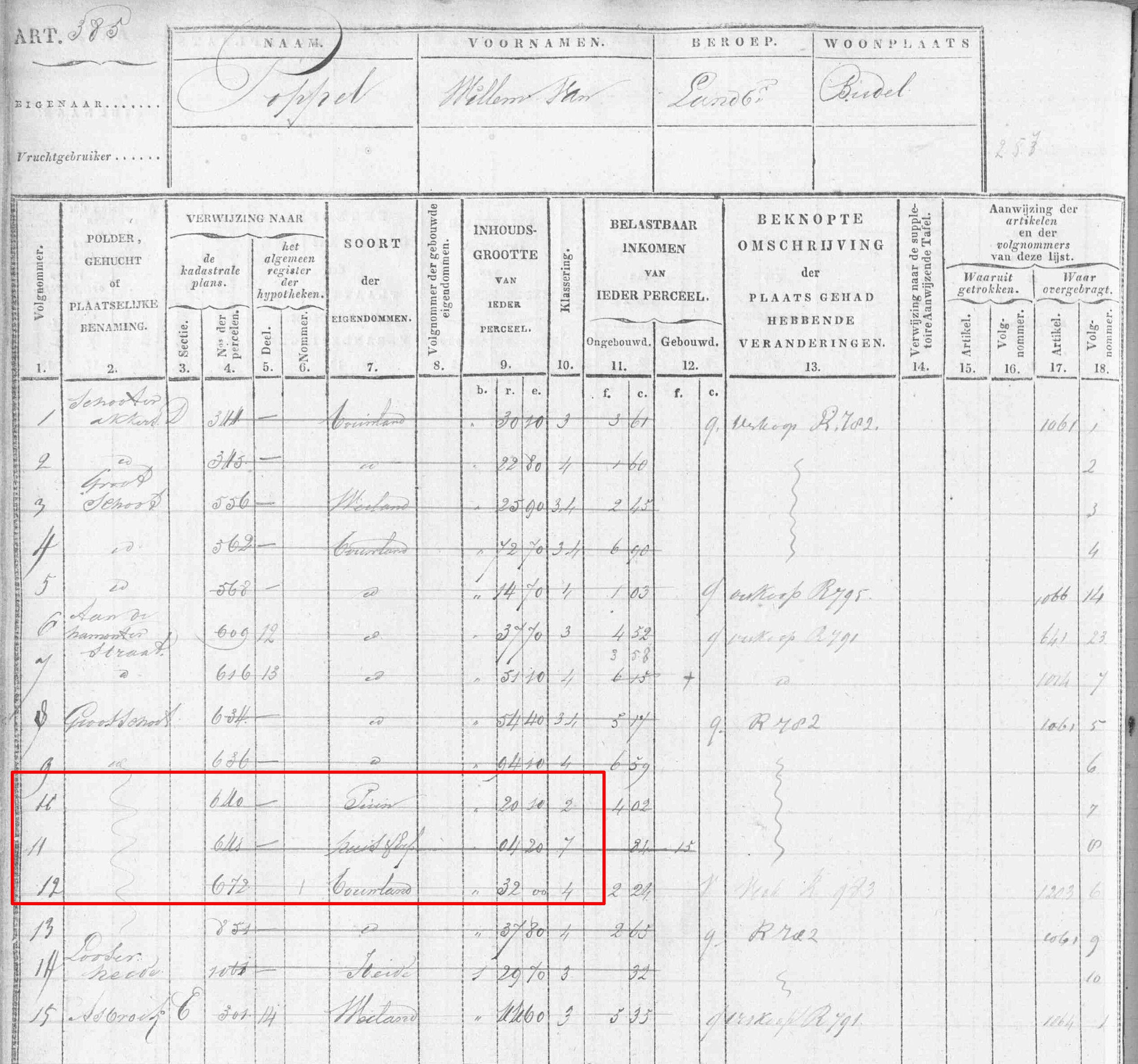 Volgens de Oorspronkelijk Aanwijzende Tafel (O.A.T.) van 1832 was de eigenaar van huis en erf D-0641 Willem van Poppel. In kolom 9 wordt verwezen naar artikel 385 van de kadastrale legger, een nieuwe wijze van kadastrale registratie, die rond 1840 ingevoerd werd. (3)