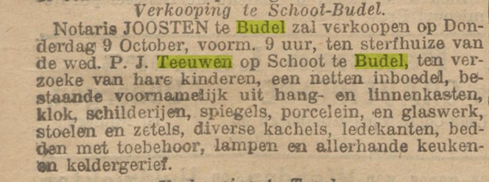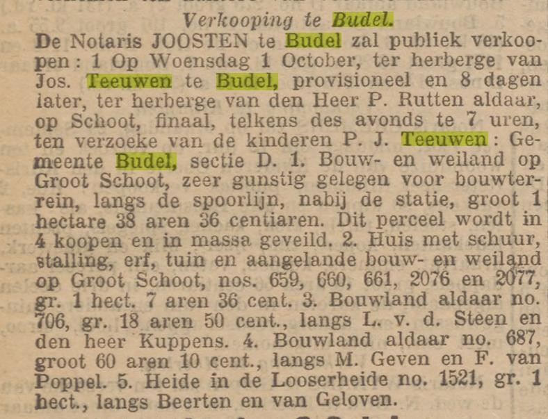 1895 Na het overlijden van Peter Johannes Teeuwen wordt Maria Mertens voor ½ deel eigenaar en de kinderen ieder voor 1⁄6 deel.