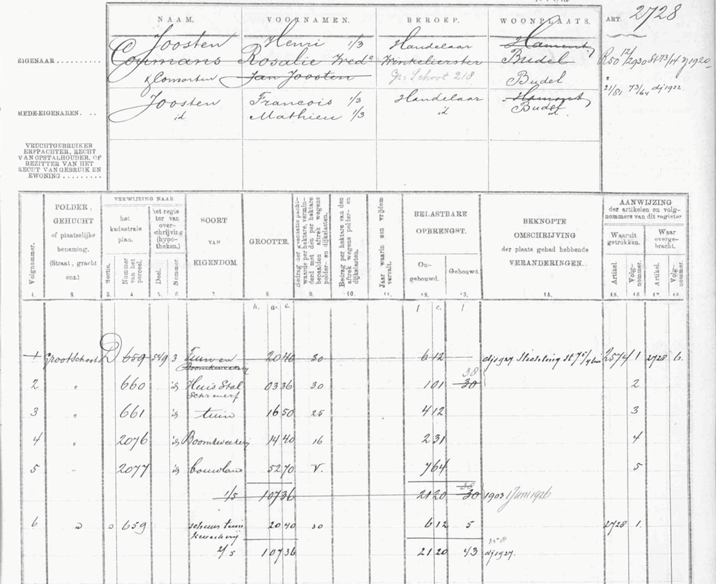 In 1902 wordt de weduwe Maria Rosalia Beatrix Coumans geboren 17-08-1853 te Weert, overleden 12-06-1915 te Hamont, gehuwd op 20-07-1877 te Hamont met Jan Jacob Joosten eigenaar.