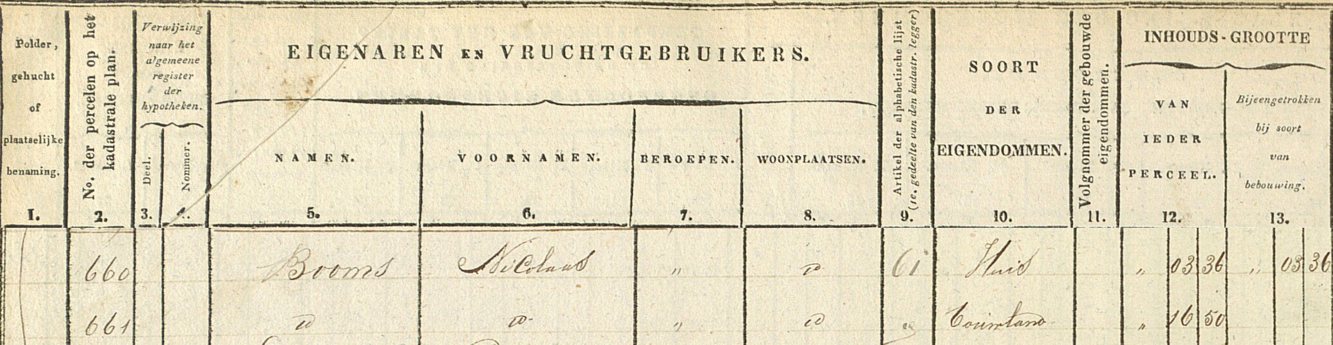 Dus hier zijn Nicolaas Booms en Anna Maria Elisabeth Booms ieder voor ½ deel eigenaar.