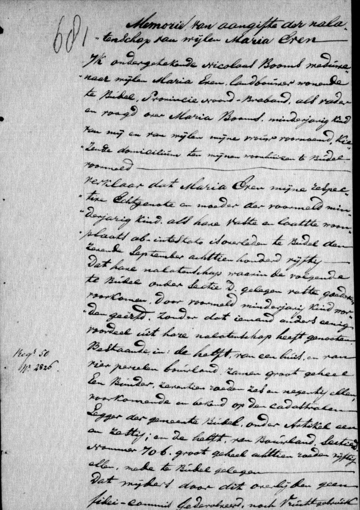 Verklaar dat Maria Even mijne respective echtgenote en moeder der voormeld minderjarig kind, als hare vaste en laatste woonplaats ab intestato (zonder geldig testament) is overleden te Budel den zevende september achttien honderd vijftig. Dat hare nalatenschap waarin de volgende te Budel onder sectie D. gelegen vaste goederen voorkomen. Door voormeld minderjarig kind worden geerfd, zonder dat iemand anders eenig voordeel uit hare nalatenschap heeft genooten. Bestaande in de helft van een huis en van vier percelen bouwland, samen groot geheel een bunder, zeventien roeden zes en negentig ellen. Voorkomende en bekend op de cadastralen legger der gemeente Budel, onder artikel een en zestig.