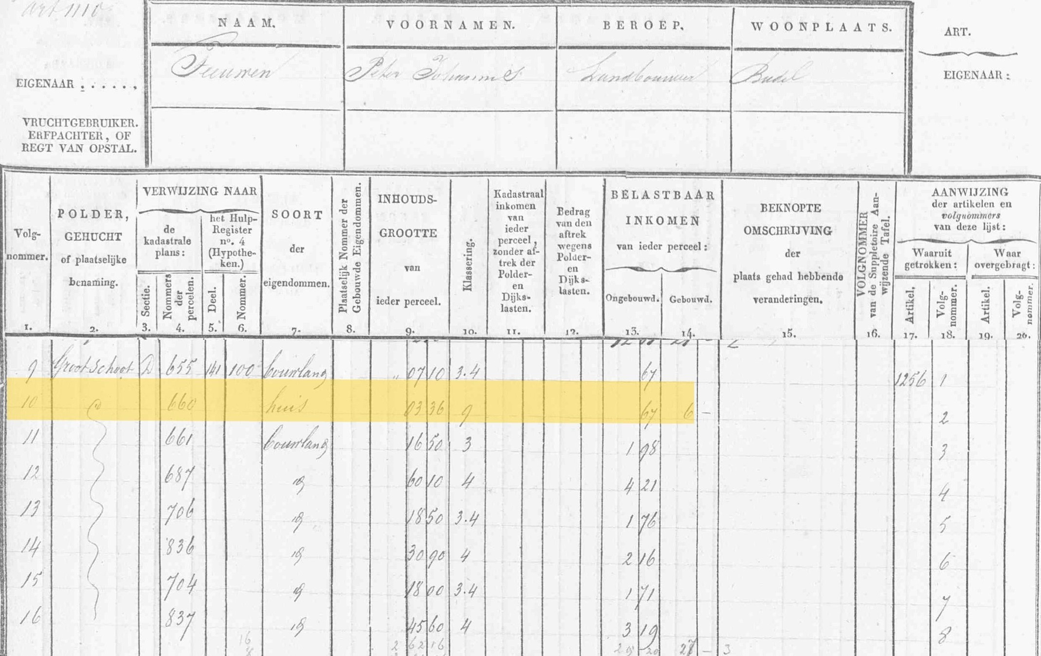 De nieuwe wijze van kadastrale registratie (P.K.L. Persoonlijke Kadastrale Legger). Voor Nicolaas Booms werd artikel 61, met o.a. Huis en erf D-0660 geopend. |