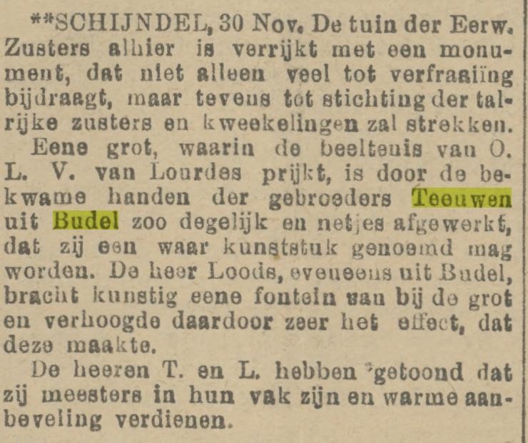 Peter Johannes (Piet) Teeuwen (1857), "Piet van Pier van d'n Topper", werkte samen met zijn broer Gerardus (Graod), thuis bij zijn vader op de kwekerij en deed het onderhoud van de tuinen van kloosters. Piet is ook naar Lourdes gegaan om daar de grot met Maria erin en Bernadette ervoor te bekijken en na te tekenen. Later heeft hij deze "Lourdesgrot" op vele kloosters nagemaakt.