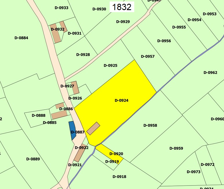 Een gedeelte van de gedigitaliseerde minuutplan uit 1832 met o.a.de boerderij D-0923. D-0923 erf huis. D-0924 bouwland D-0920 tuin. Eigenaar 1832-1888 Renier Vissers. |