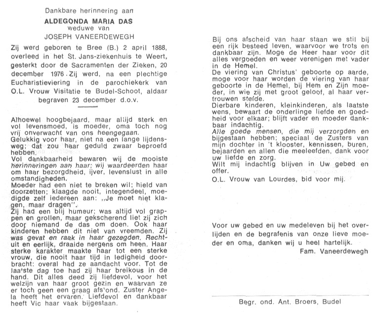 Aldegonda Maria | Das | 02-04-1888 | Bree | 20-12-1976 | Weert |