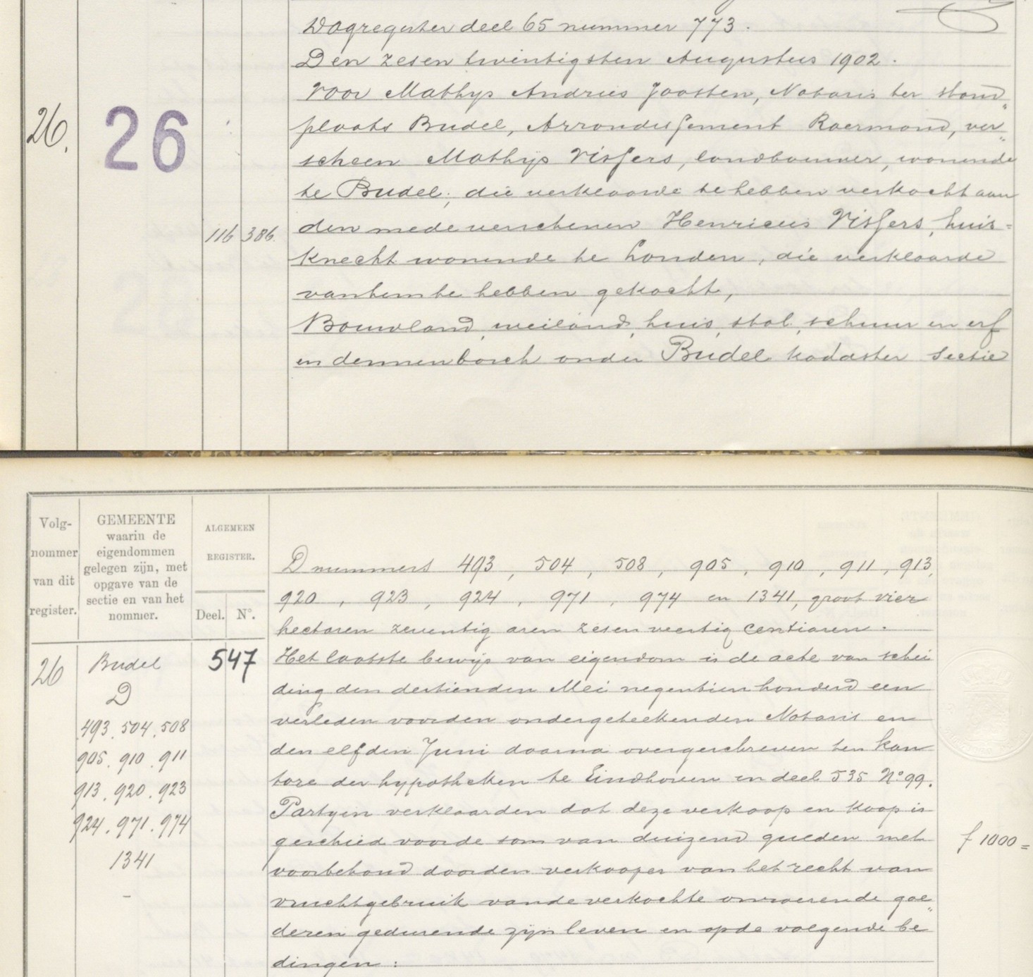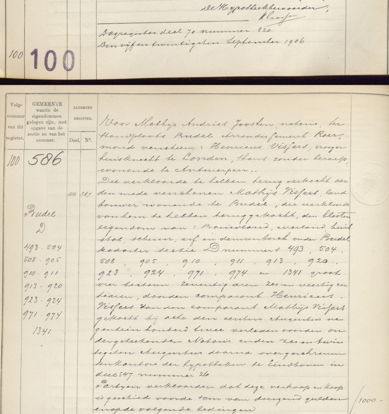En onder de akte uit 1906 waarin staat dat Mathijs Vissers alles weer terugkoopt, ook weer voor 1000 gulden.