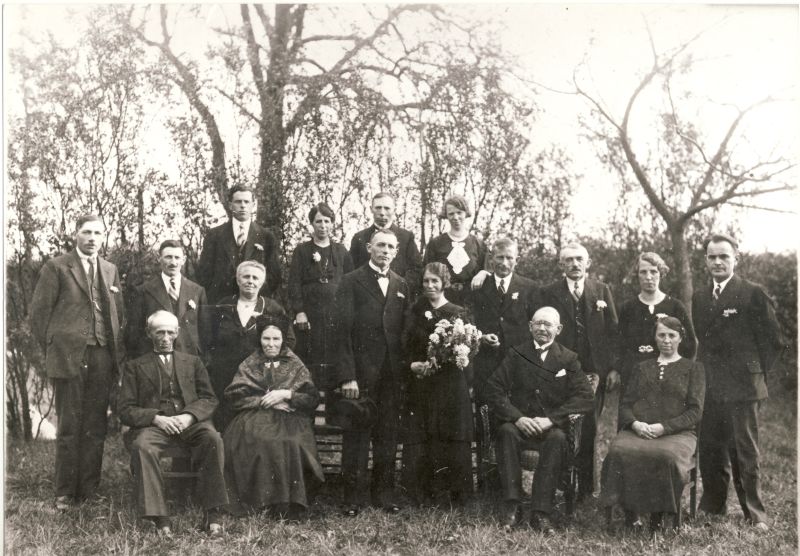 Huwelijksfoto van Christiaan Aarts en Maria Looymans te Borkel en Schaft op 28-10-1937. Voorste rij v.l.n.r.: Peter Johannes Looijmans, Petronella Van Oijen, Christiaan Aarts, Maria Looymans, Peterus Aarts, en Maria Helena Looijmans. Tweede rij v.l.n.r.: (waarschijnlijk Wilhelmus*) Aarts (broer van bruidegom), Joannes Mathijs Looijmans, Maria Lucia Van der Steen, Lourentius Philippus de Goeij, Petrus Johannes ("Pier") Damen, Bertha Looijmans, en Wilhelmus van Rooij. Derde rij v.l.n.r.: Theodorus Looijmans, Hendrika Looymans, (waarschijnlijk Antonie*) Aarts (broer van bruidegom), en Anna Maria Looijmans. *Wilhelmus was de oudste, en Antonie de jongste broer van de bruidegom. |