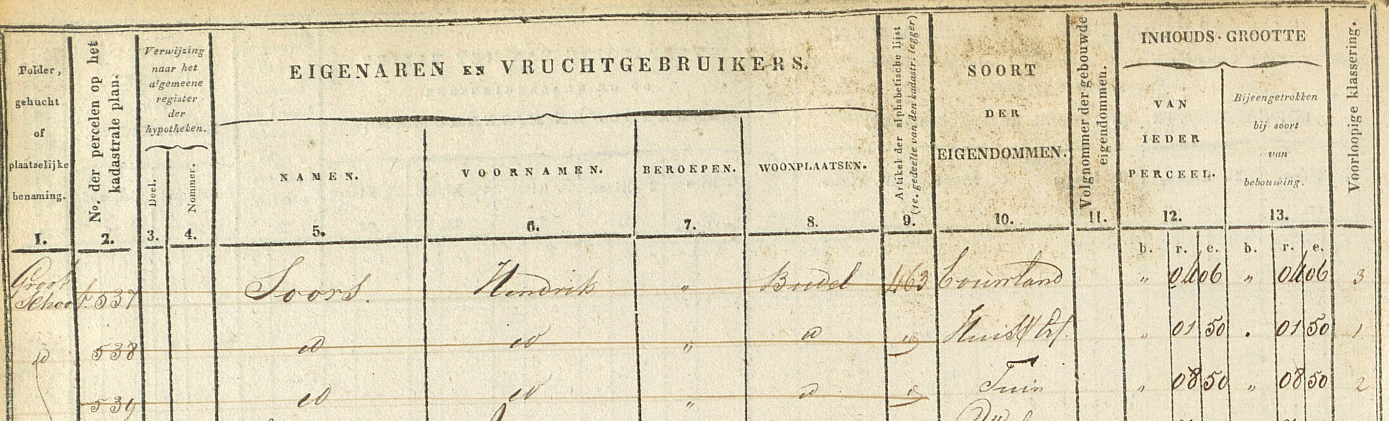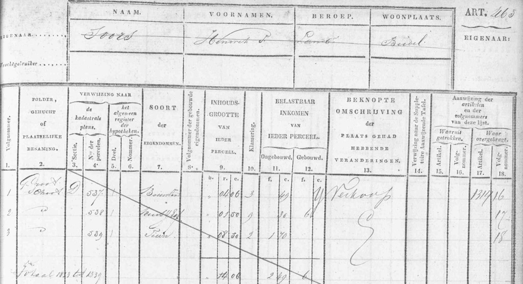 Volgens de Oorspronkelijk Aanwijzende Tafel (O.A.T.) van 1832 was de eigenaar van huis en erf D-0538 Hendrik Soors (Soers), landbouwer te Budel. In kolom 9 wordt verwezen naar artikel 463 van de kadastrale legger, een nieuwe wijze van kadastrale registratie, die rond 1840 ingevoerd werd.