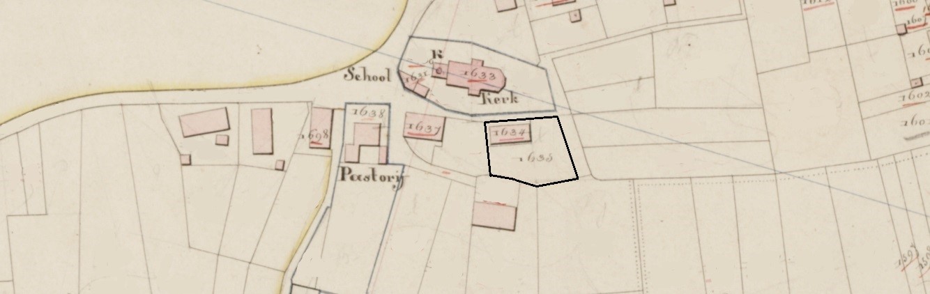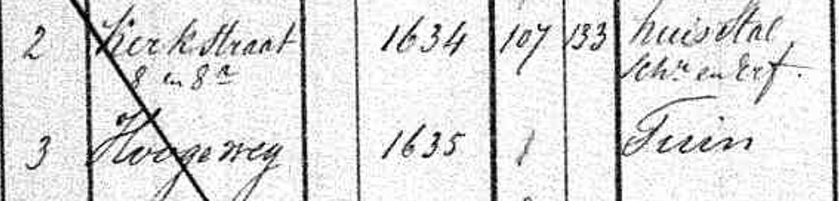 ![]() | Vreemd en verwarrend, het perceel A-1634 waar het huis staat, omschreven als huis, stal, schuur en erf, ligt dan aan de Kerstraat 8 en 8a, terwijl de tuin A-1635 aan de Hoogeweg blijft liggen. |