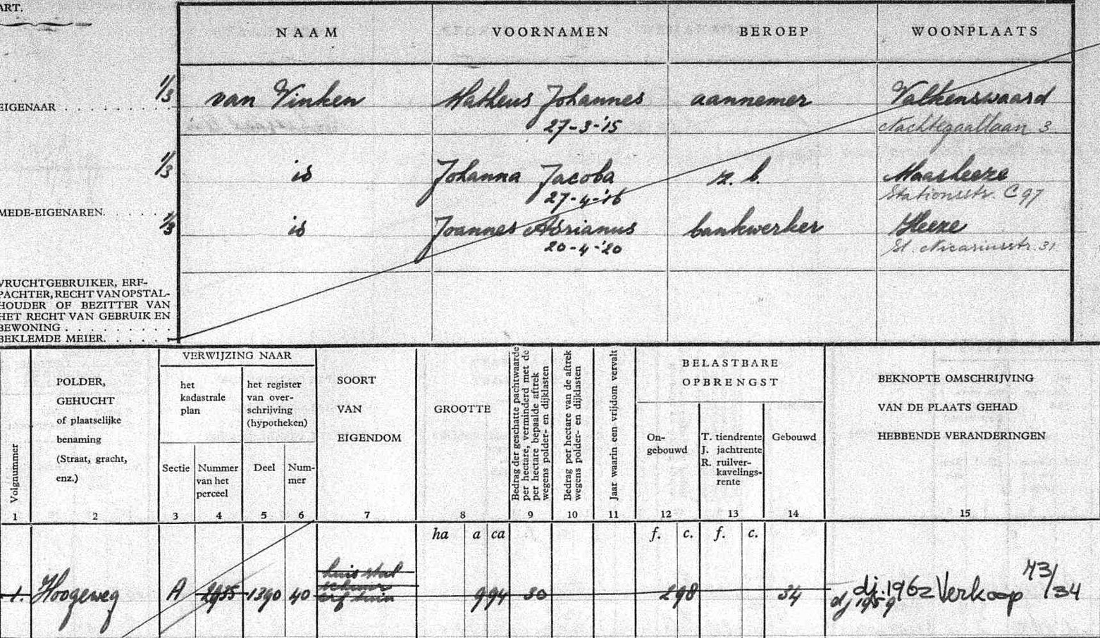 De boerderij wordt verkocht en de nieuwe eigenaren zijn Matheus Johannes (aannemer) Joannes (bankwerker) en Johanna Jacoba van Vinken.