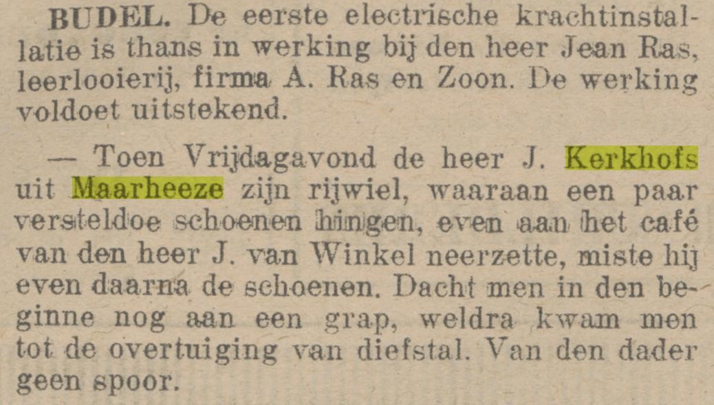In 1918, wellicht tijdens een bezoek aan een van de kinderen in Budel, wordt Jan Kerkhofs nog het slachtoffer van een diefstal. Het onderstaande krantenartikel spreekt verder voor zich.
