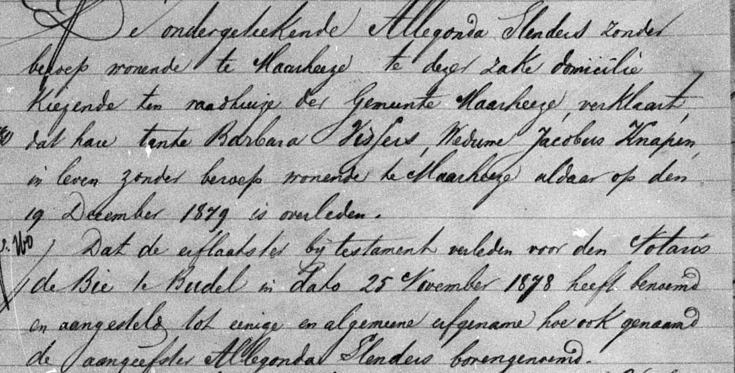Dat de erflaatster bij testament verleden voor den notaris de Bie te Budel in dato 25 november 1878 heeft benoemd en aangesteld tot eenige en algemeene erfgename hoe ook genaamd de aangeefster Allegonda Slenders bovengenoemd.