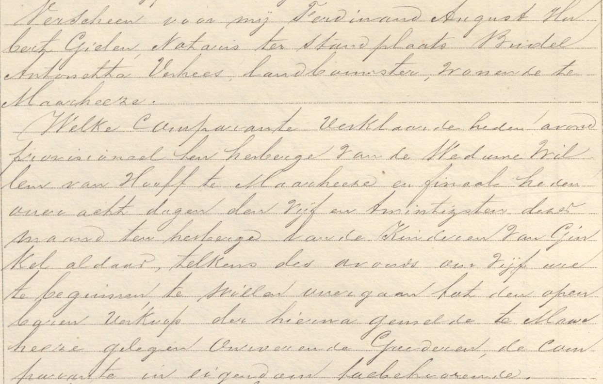 Heden den achttienden februari achttienhonderd vijfentachtig, verscheen voor mij Ferdinand August Herbert Gielen notaris ter standplaats Budel, Antonetta Verhees, landbouwster, wonende te Maarheeze.