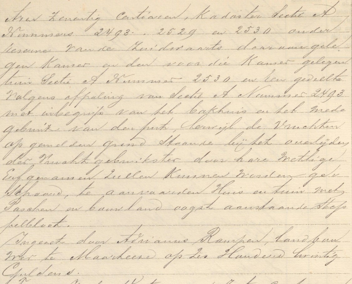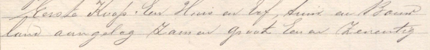 Eerste koop: een huis en erf, tuin en bouwland, aangelag zamen groot een en zeventig aren zeventig centiaren, kadaster Sectie A nummers 2493, 2529, en 2530 onder resume van de zuidwaarts daaraan gelegen kamer en den voor die kamer gelegen tuin Sectie nummer 2530 en een gedeelte volgens afpaling van Sectie A nummer 2493 met inbegrip van het bakhuis en het mede gebruik van den put, terwijl de vruchten op gemelden grond staande bij het overlijden der vrucht gebruikster door hare wettige erfgenamen zullen kunnen worden geschaard, te aanvaarden huis en tuin met Paschen en bouwland oogst aanstaande stoppelbloot