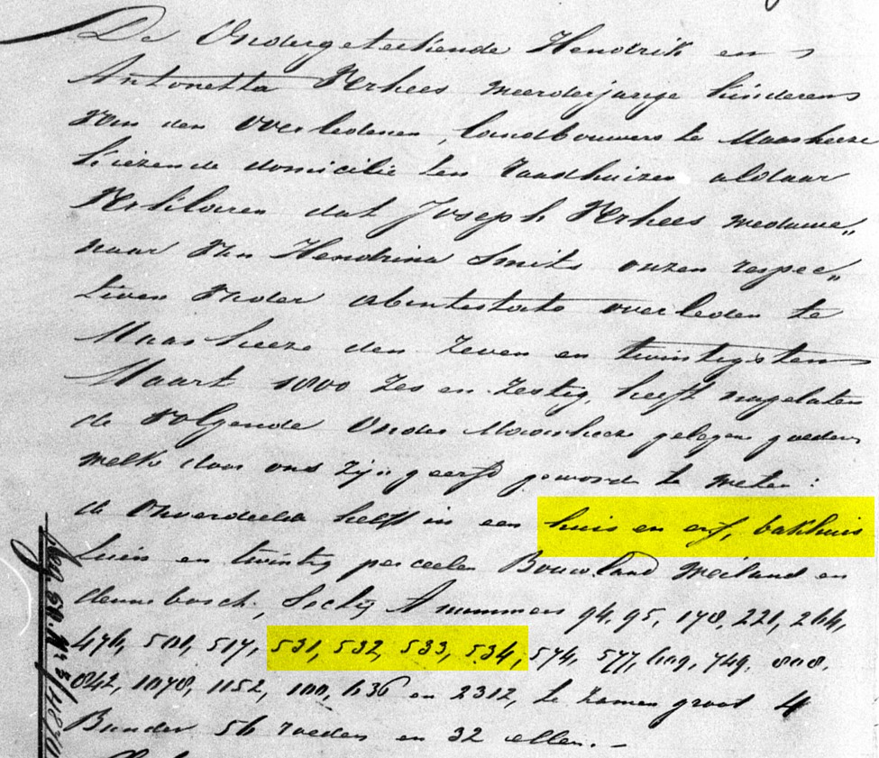 Ingeschreven op de kadastrale legger: "Door Antonetta Verhees gereserveerd gedurende haar leven de kamer en een gedeelte van den tuin voor de kamer gelegen."