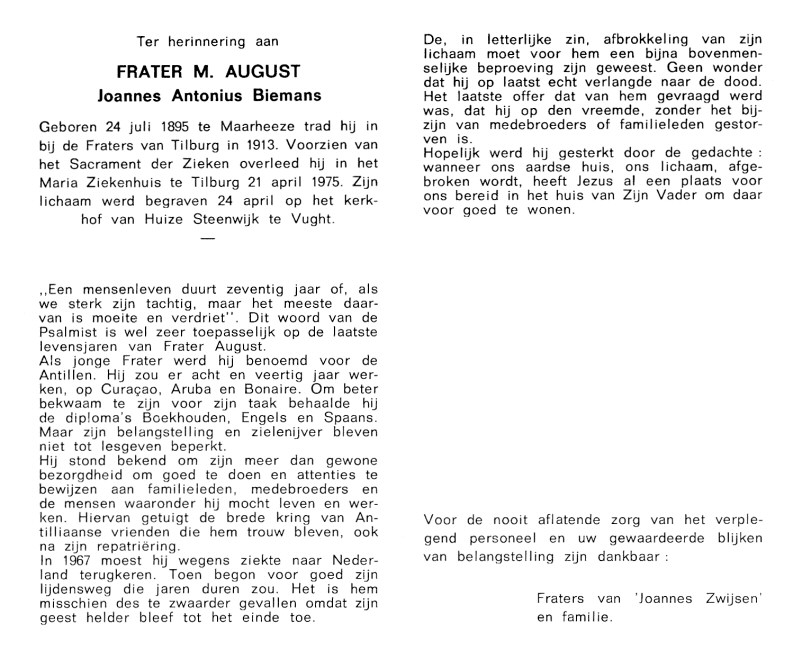 Joannes Antonius | Biemans | 24-07-1895 | Maarheeze | 21-04-1975 | Tilburg |