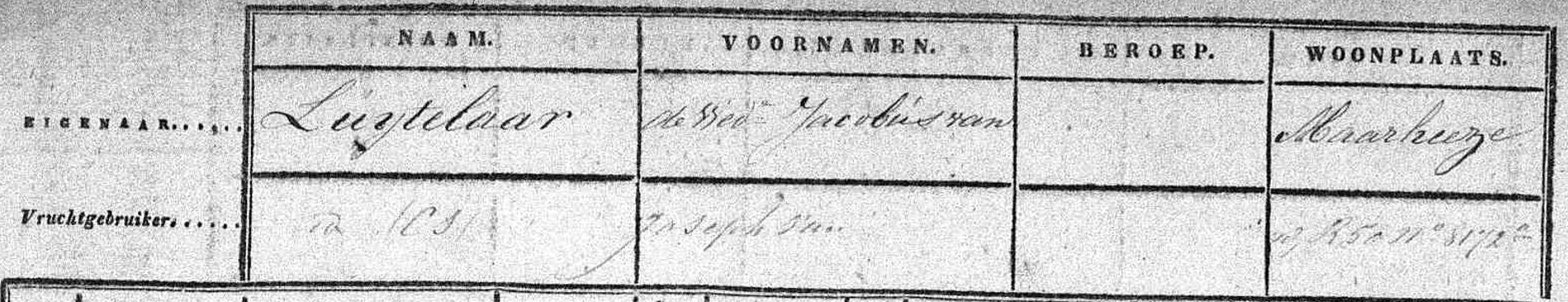 Met het overlijden van Joseph van Luijtelaar wordt zus Josina / Justina de nieuwe eigenaar. Josina, gehuwd met Gerardus Segers, zijn op dat moment de enige eigenaar / inwoners, en er is geen vruchtgebruiker.