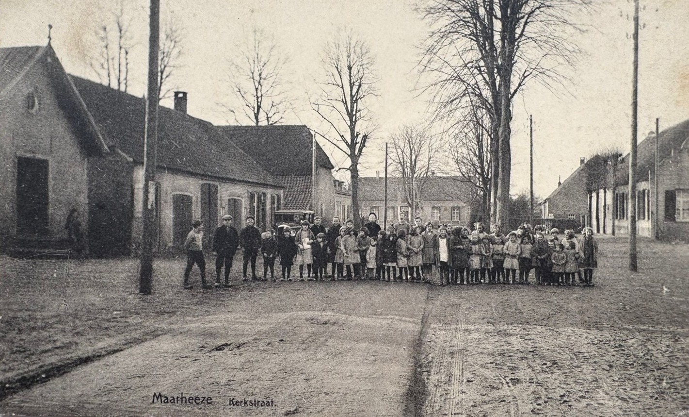 Maarheeze Kerkstraat rond 1920. Links allereerst de roomboterfabriek, later het Pandje. Daarnaast, de boerderij Michiel Biemans wat later Jan Antonie Guns wordt, gevolgd door Johannes Wilhelmus Praats gehuwd met Hendrika Josephina Guns. Zie perceel A-1623.