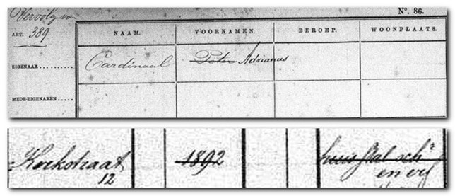 Na het overlijden van Peter Cardinaal staat diens broer Adrianus ingeschreven als eigenaar, en het pand heeft als adres Kerkstraat 12.