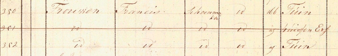 Maarheeze 14 februari 1850, Catharina Bekkers overleden. Francis verkoopt zijn bezit aan Martinus Lokermans, de buurman. (Zie A-355).