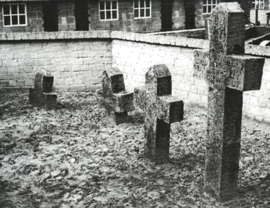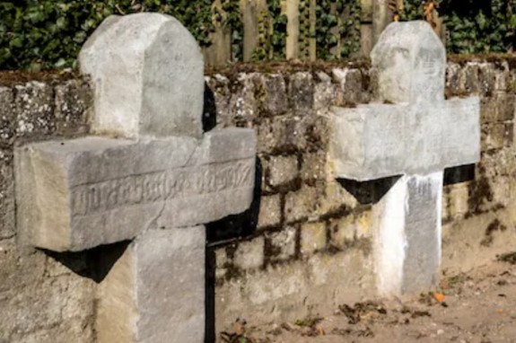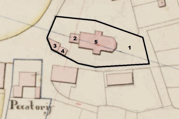 Het oorspronkelijk (kleine) kerkhof lag aan de achterzijde van de kerk. Het geheel, inclusief het dorpshuis en het schoolhuis is omringd door een muur met ezelsrug afdekking, en stamt uit de 16e eeuw. In 1754 werd de muur vernieuwd. Een ezelsrug afdekking is een halfronde of spits gebogen afwerking boven op een muur. Regenwater loopt op deze manier aan beide kanten van de muur af, wat doorsijpelen en erosie voorkomt. |