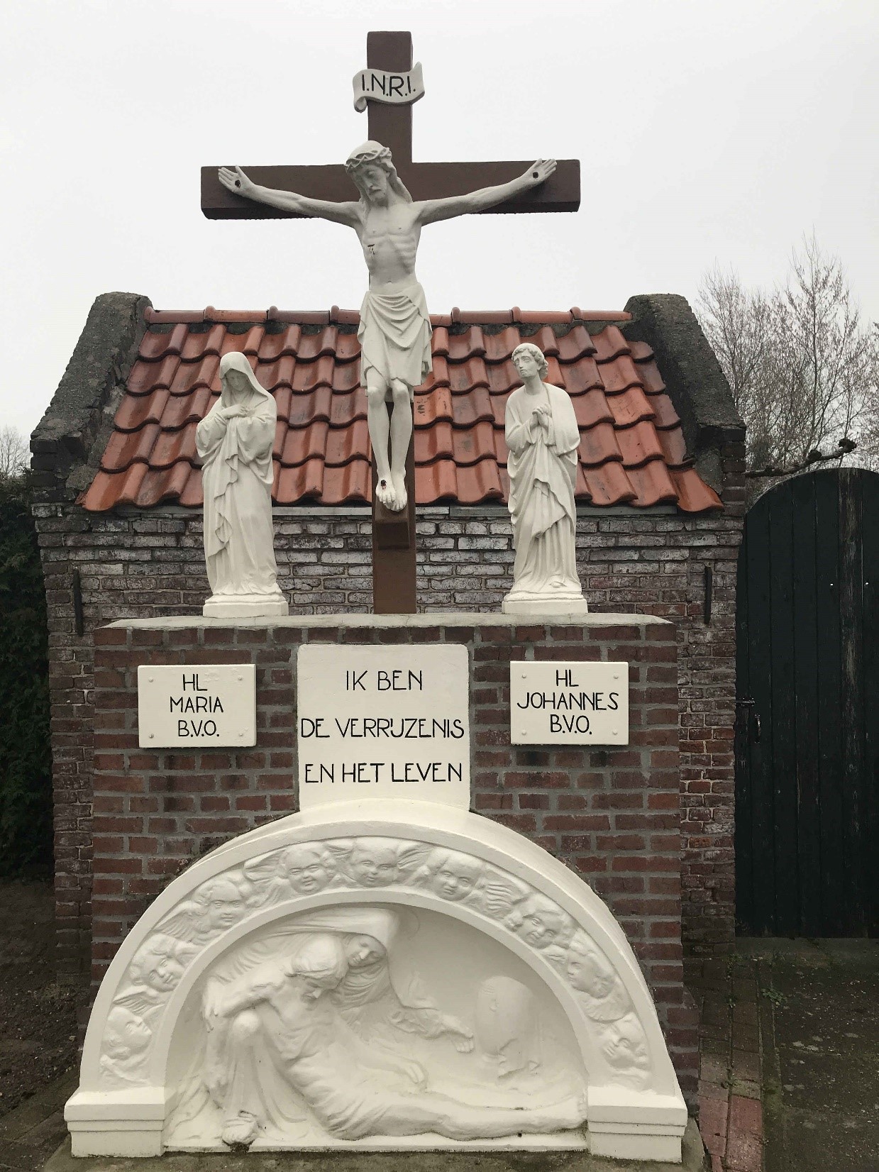 Er staat een calvarie groep op het kerkhof, voor het oude knekelhuisje zoals te zien op bovenstaande foto. Een calvariegroep stelt de scène van Golgotha (de Calvarieberg) voor, waar Jesus werd gekruisigd. Klassiek bevat zo'n groep Jesus aan het kruis of na de kruisafname, Maria, zijn moeder, Johannes de Evangelist. Soms ook met Maria Magdalena, soldaten of engelen. Een calvarie groep is een typisch katholiek religieus monument met wortels in de middeleeuwse graf cultuur, bedoeld om het lijden en sterven van Christus te verbeelden en de gelovigen tot bezinning te brengen. In Maarheeze vervult deze groep bovendien een bijzondere rol als visueel middelpunt van het oude parochie kerkhof, dat op de plaats ligt van de voormalige middeleeuwse kerk. De beelden staan op een gemetselde stenen sokkel. Versierd met engelenkopjes. Bovengenoemde calvarie groep staat vόόr het ossuarium of knekelhuisje op het kerkhof. |