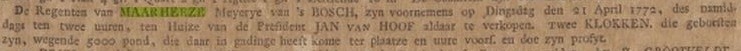 De Regenten van MAARHEEZE Meyerye van 's BOSCH, zijn voornemens op Dinsdag de 21 April 1772, des namiddags ten twee uuren, ten Huize van de President JAN van HOF aldaar te verkoopen, twee KLOKKEN die geborsten zijn, wegende 5000 pond, die daar in gadinge heeft kome ter plaatze en uure vooraf en doe zyn profyt.