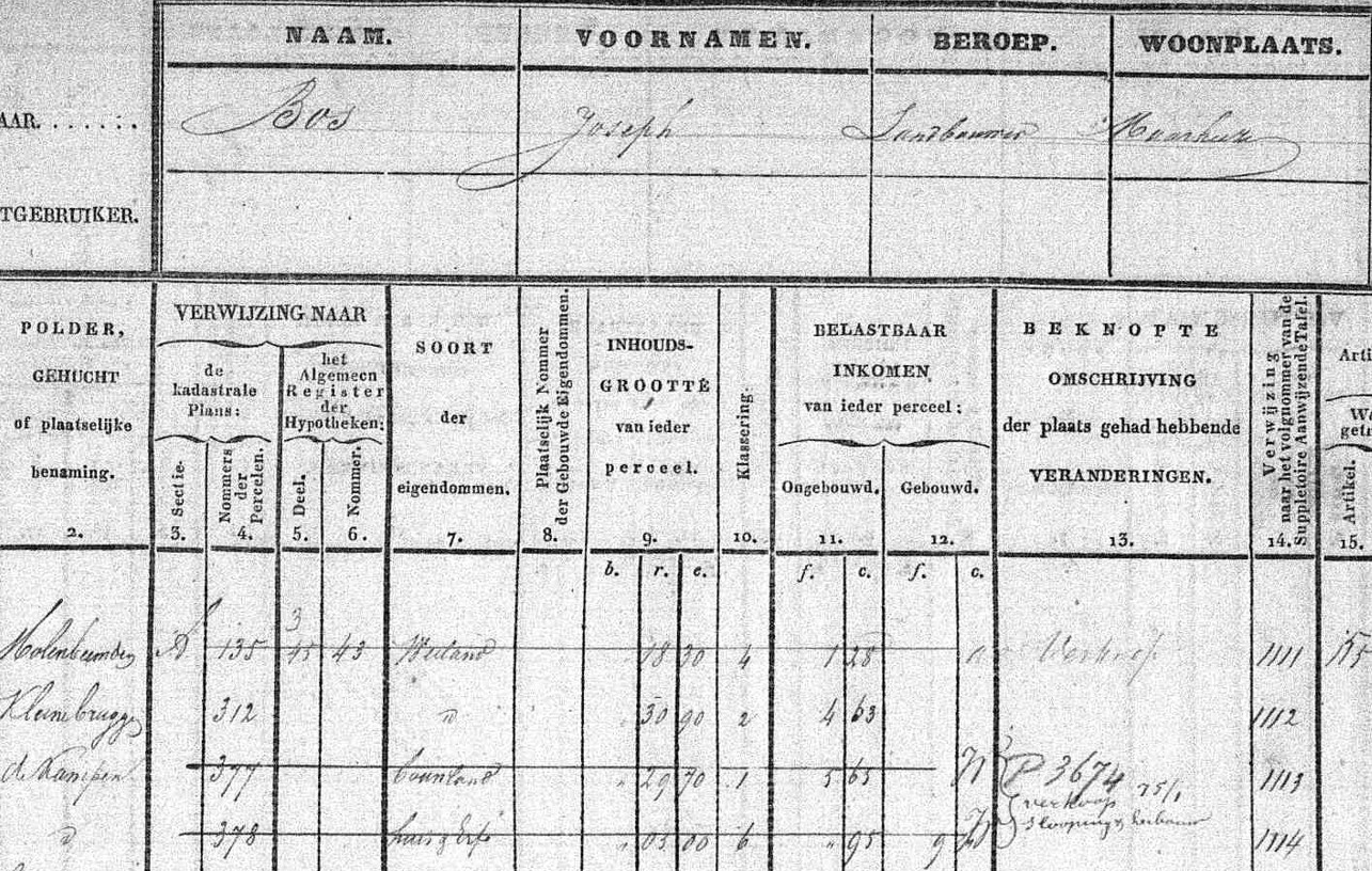 Perceel nummer | Eigenaar | Soort eigendom | 1854 | 1878 | 1939 | 1973 |