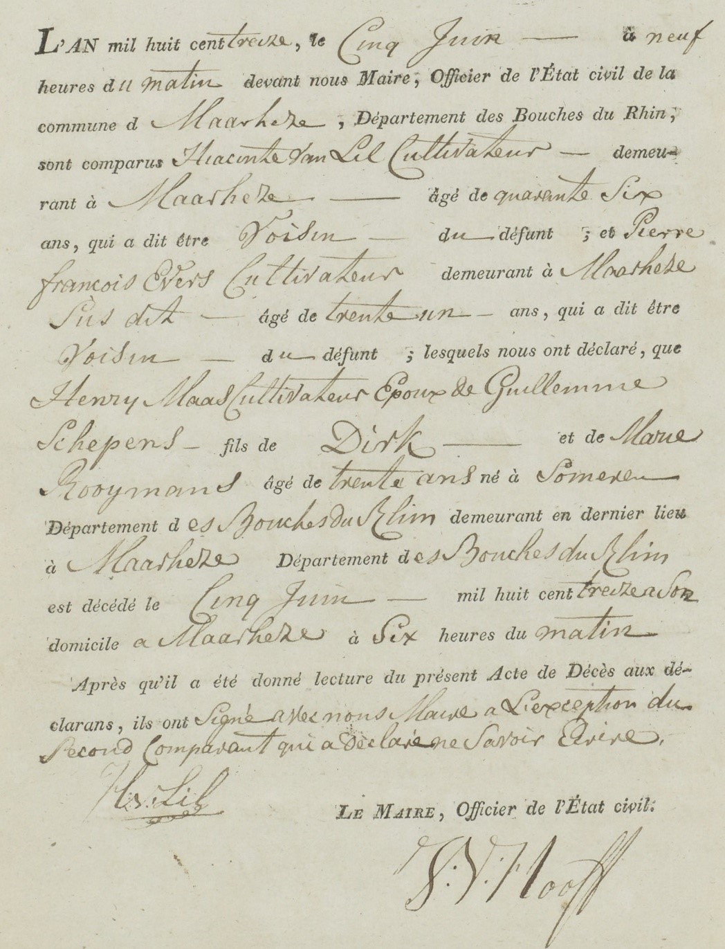 Hendrik Maas, geboren Someren, overleden Maarheeze 2 april 1813. Hij huwt tussen 1805-1807 de weduwe Wilhelma Schepens.