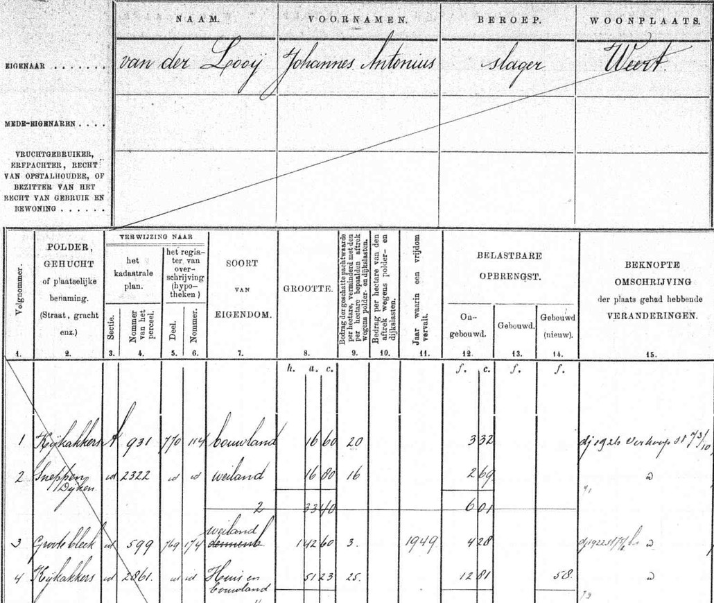 Perceel nummer | Eigenaar Landbouwer | Soort eigendom | 1854 | 1858 | 1879 | 1915 | 1977 |