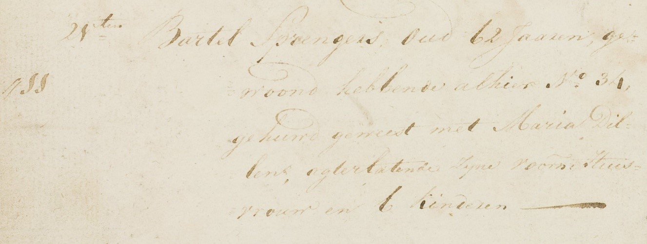 Bartel Sprengers, oud 62 jaaren gewoond hebbende alhier No. 34 gehuwd geweest met Maria Dillen, agterlatende zijne voornoemde, vrouw en kinderen.