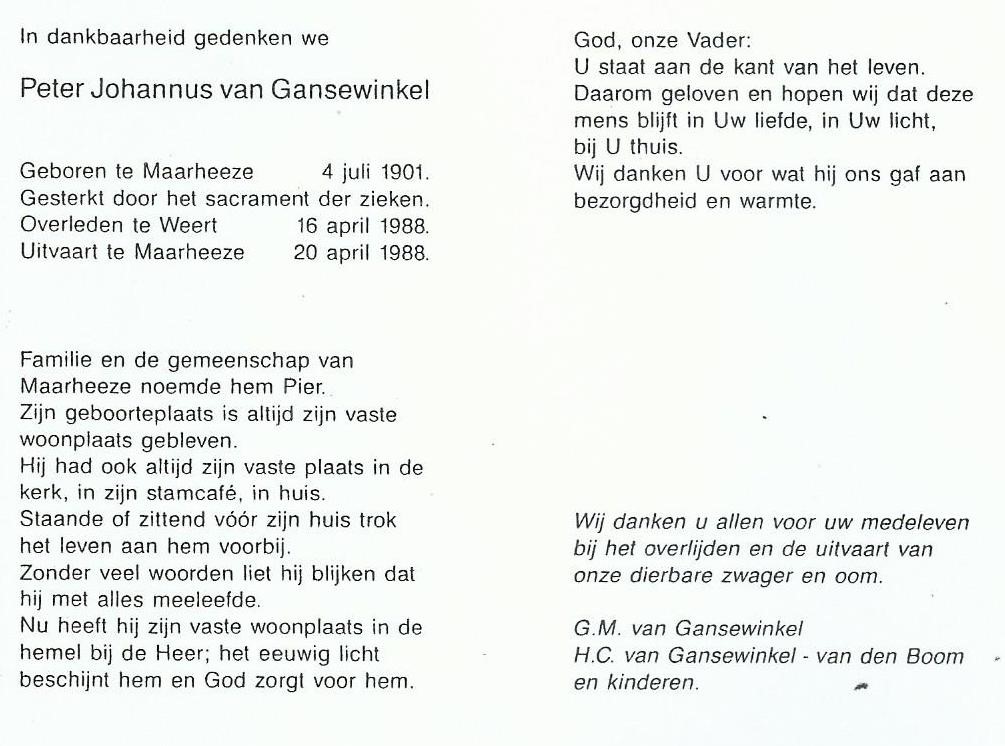 Peter Johannus | v Gansewinkel | 04-07-1901 | Maarheeze | 16-04-1988 | Weert |