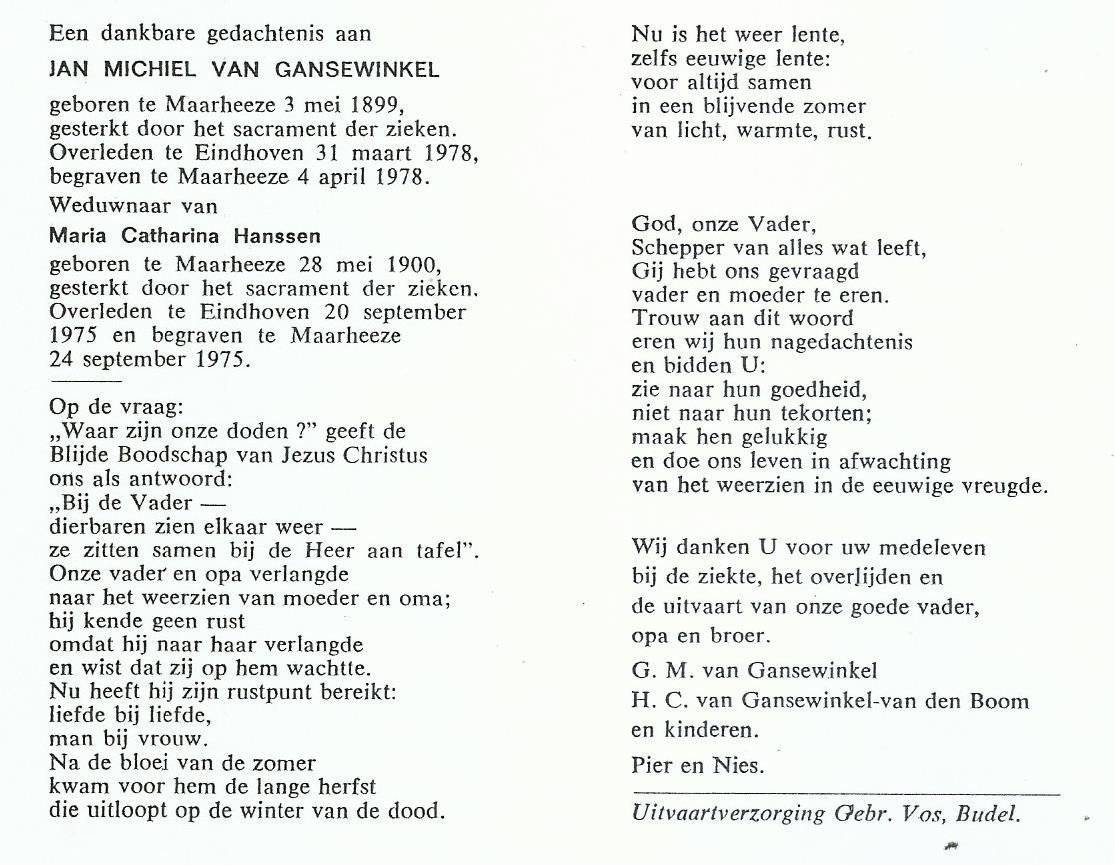 Jan Michiel | v Gansewinkel | 03-05-1899 | Maarheeze | 31-03-1978 | Eindhoven |