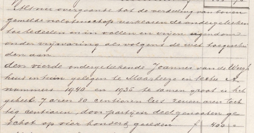 En een tuintje zoals afgescheiden sectie A nummer negentien honderd zeven en dertig groot eene roede vijftig ellen, aan elkanderen een zijde de kinderen Hyacinthus van Lil en andere zijde de vrouw van Jan van der Putten.