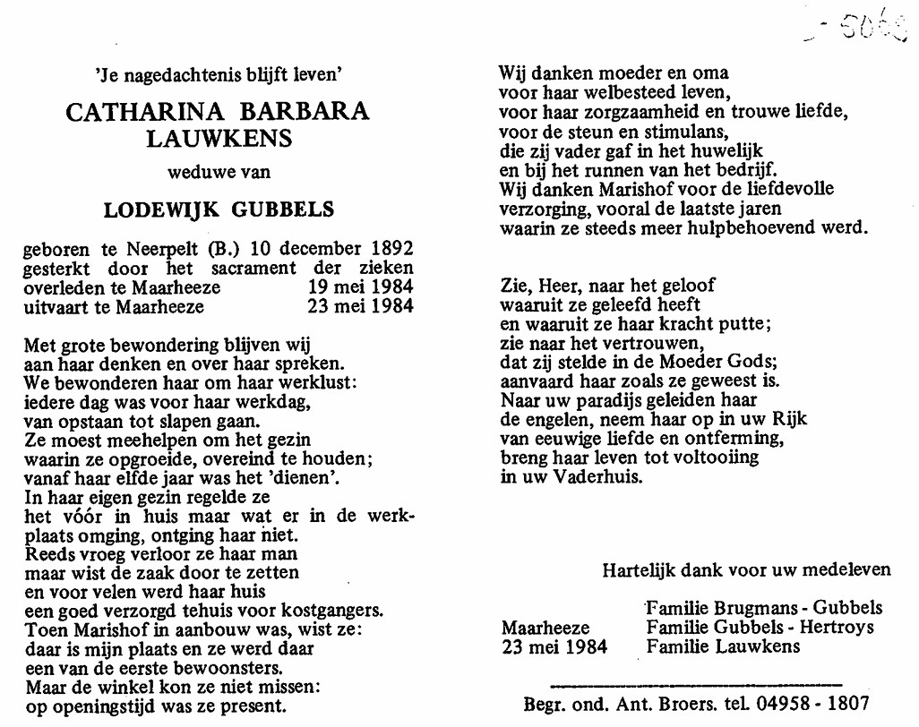 | Catharina Barbara | Lauwkens | 10-12-1892 | Neerpelt | 19-05-1984 | Maarheeze |