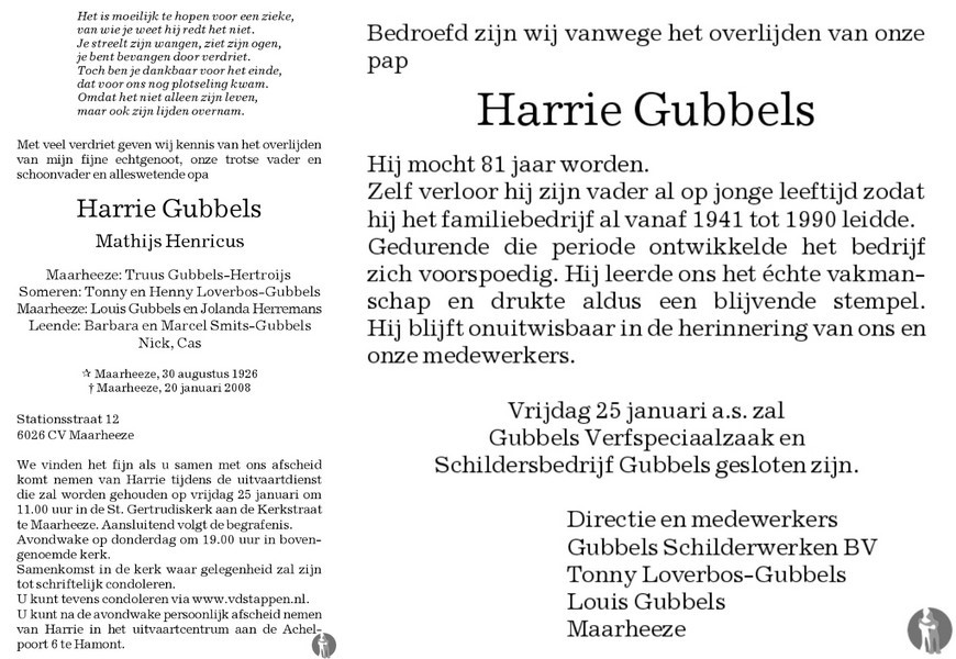 Harrie Gubbels overleed Maarheeze 20 januari 2008, en wordt opgevolgd door zoon Louis Gubbels.
