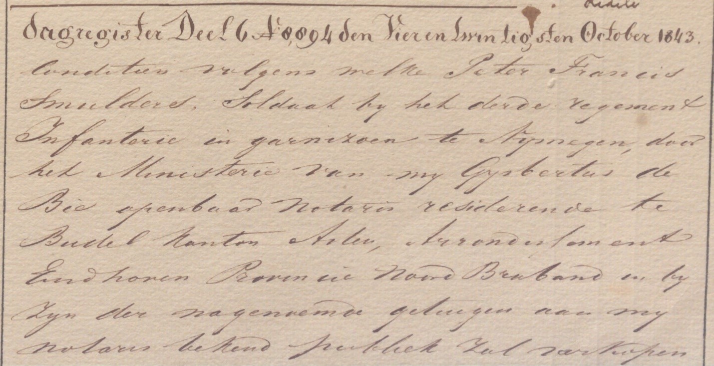 Conditiën volgens welke Peter Francis Smulders, soldaat bij het derde regiment infanterie in garnizoen te Nijmegen, door het ministerie van mij Gijsbertus de Bie, openbaar notaris residerende te Budel kanton Asten, arrondissement Eindhoven Baronie Noord Brabant in bijzijn der nagenoemde getuigen aan mij notaris bekend, publiek zal verkopen de volgende te Maarheeze vaste goederen, hem aangekomen bij deling voor mij notaris en getuigen te Maarheeze den tienden februari achttien honderd zes en dertig.