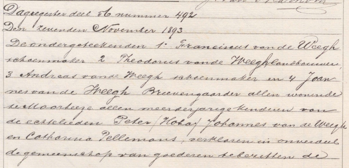 Na het overlijden van Catharina Pellemans in 1893 gaan de overgebleven kinderen naar de notaris teneinde tot een verdeling van de geërfde bezittingen te komen: