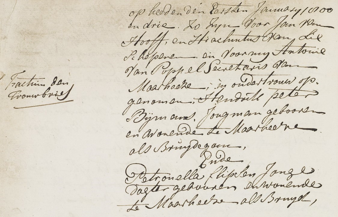 Bovenstaande akte laat de trouwinschrijving zien van Hendrik Peter Bijmans en Petronella Flipsen, Maarheeze 25 november 1815.