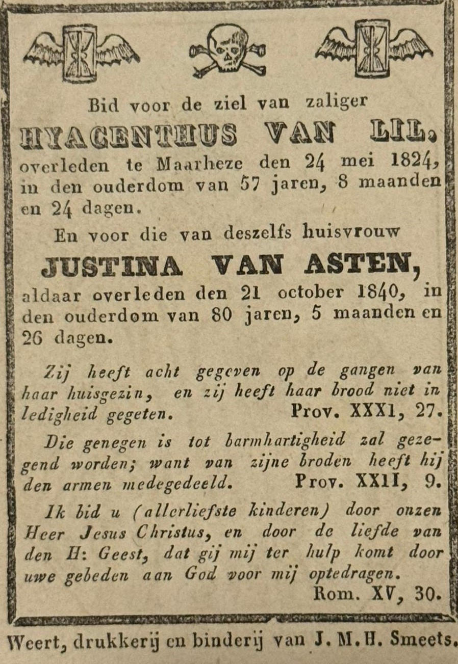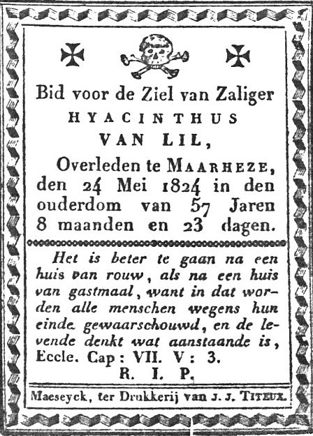 Hyacinthus van Lil werd gedoopt Maarheeze 3 juli 1766. Hij trouwt Heeze 24 april 1796 met Justina van Asten (1760-1840), uit huwelijk zijn drie kinderen bekend.