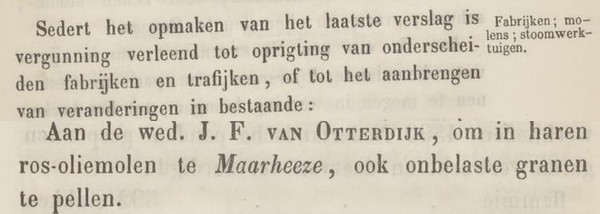 Het jaarlijks terug kerend verslag van de toestand in de provincie Noord-Brabant laat in 1854 zien dat de weduwe J.F. van otterdijk (Jacoba van Lil) een vrijstelling krijgt om ook onbelaste granen te pellen. (Pellen, volgens het molenwoordenboek het omhulsel verwijderen van gerst, rijst en spelt) De ros-oliemolen is dan nog volop in gebruik.