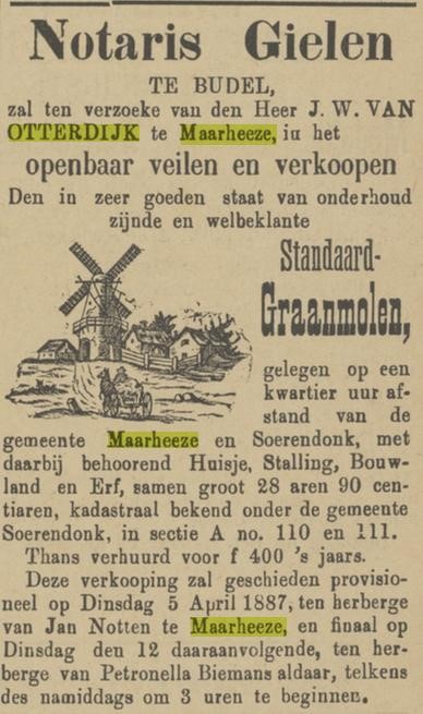 Datzelfde jaar verkoopt Jan de molen in Soerendonk aan de inwonende Jan Notten die dan ook tevens de hoofdbewoner (geen eigenaar) van het huis wordt.