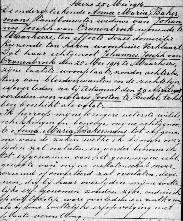Dat haar echtgenoot Johannes Joseph van Cranenbroek den 25 mei 1914 te Maarheeze, zijne laatste woonplaats, zonder achterlating van bloedverwanten in de rechte lijn is overleden na bij testament den 29e april 1907 verleden voor notaris Joosten te Budel te hebben beschikt als volgt: