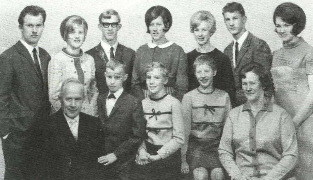 Foto rond 1964 familie Nagel-van den Bomen. V.l.n.r. boven: Ben, Riet, Jan, Nellie, Annie, Piet, Frida. Onder: Arie Nagel, Ad, Rinie, Jeannie, en Drika van den Bomen