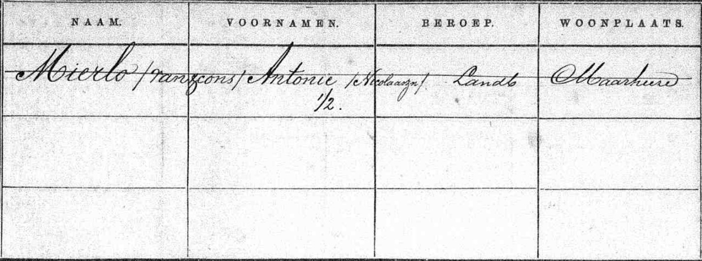 In het daaropvolgende bevolkingsregister staat Nicolaas van Mierlo als hoofd van het huishouden ingeschreven, en het eerste kind, Johanna Catharina wordt in 1855 geboren.